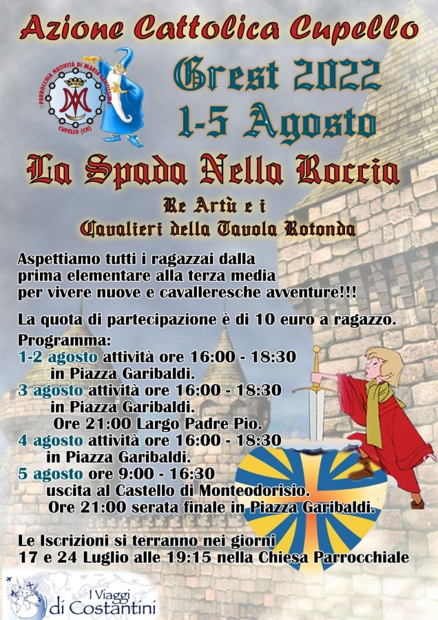 Nel mese di agosto, invece, cinque giornate saranno dedicate al Grest (1-5 agosto), per i ragazzi dai 6 ai 14 anni. Il tema scelto quest’anno è “La spada nella roccia” e i protagonisti saranno Re Artù e i Cavalieri della Tavola Rotonda. Sarà quindi l’occasione per ritrovare bambini e ragazzi e riflettere con loro su valori come giustizia, perdono, speranza e carità. All’interno del Grest, si terrà anche un’uscita al Castello di Monteodorisio. Già da ora, a proposito di questo il Consiglio AC ringrazia “l’amministrazione comunale di Monteodorisio per l’ospitalità e la disponibilità e le Autolinee Costantini per il trasporto gratuito offerto a bambini e ragazzi”. In aggiunta, l’Azione Cattolica di Cupello non si discosta dalle proposte diocesane per i gruppi Giovani, Giovanissimi ed Educatori e risponde presente a inviti come il Campo Giovani e Giovanissimi in Trentino (8-13 agosto), a cui parteciperanno 14 ragazzi, e il Campo Educatori a Campo di Giove (22-25 agosto). A conclusione dell’estate, il 27 agosto si terrà una giornata di mare fino al tramonto con Giovani e Giovanissimi, che sarà un’altra occasione per unire momenti ludici e di preghiera.