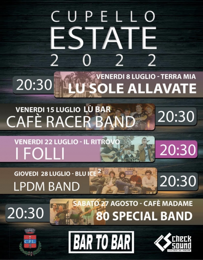 Venerdì 15 luglio, dalle ore 19.30, si terrà a Lu Bar il primo appuntamento della rassegna “Bar to Bar”, che accompagnerà tutta l'estate cupellese fino al 27 agosto. Nel corso della serata, si potranno gustare panini, tra cui hamburger e hot dog, e arrosticini, accompagnati da bevande di ogni tipo.