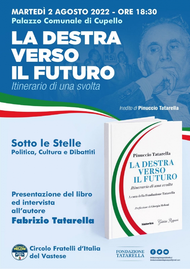 Oggi, martedì 2 agosto, alle ore 18:30, a Cupello, presso il Giardinetto comunale, il circolo di Fratelli d’Italia del Vastese presenterà, insieme all’autore Fabrizio Tatarella, nipote del defunto onorevole Pinuccio Tatarella, il libro “La Destra verso il Futuro. Itinerario di una svolta.”