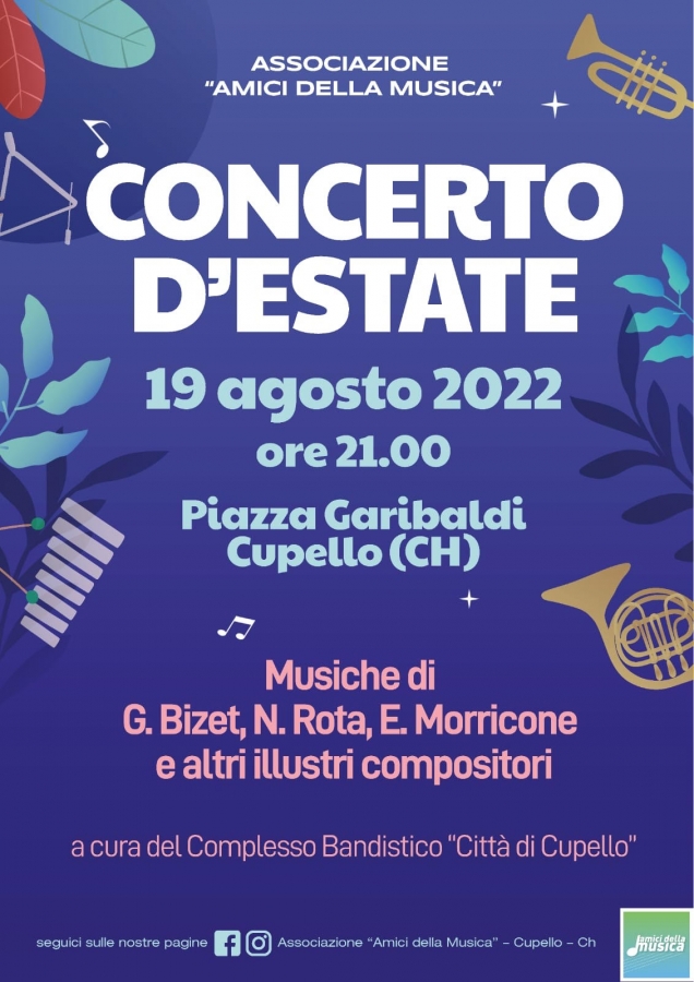 Venerdì 19 agosto, alle ore 21.00, in Piazza Garibaldi, il Complesso Bandistico “Città di Cupello” proporrà una serie di brani di compositori come Georges Bizet, Nino Rota, Ennio Morricone e altri.