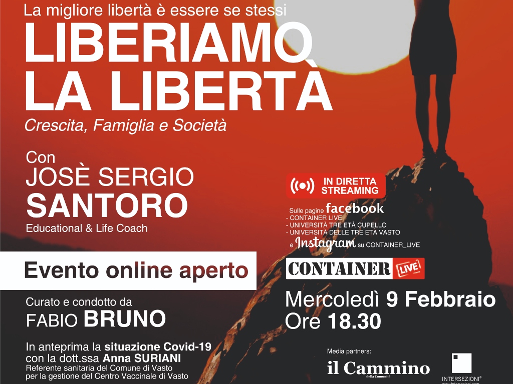 “Liberiamo la libertà” l’incontro che si terrà domani 9 febbraio alle 18.30, andrà in onda in diretta streaming sulle pagine di Facebook Conteiner LIVE (su Instagram conteiner_live), Università Tre Età Cupello, Università delle Tre Età Vasto, presieduto da Josè Sergio Santoro come educational life coach con la conduzione di Fabio Bruno. L’argomento centrale del dibattito sarà la libertà, come concetto compromesso purtroppo dalla pandemia da Covid-19 che ha caratterizzato questi ultimi due anni. Interessante sarà anche l’intervento della dottoressa Anna Suriani, Referente Sanitaria del Comune di Vasto per la gestione del centro vaccinale. Un’ottima occasione di confronto e dialogo per sconfiggere la paura di questi tempi incerti.