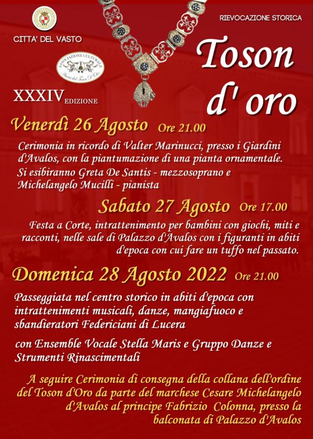 Riparte dopo un lungo stop la rievocazione storica tutta vastese “Toson d’Oro” giunta alla sua 34^edizione. Quest’anno la manifestazione sarà distribuita in tre giorni, pieni di attività per ritornare a festeggiare insieme alla cittadinanza.