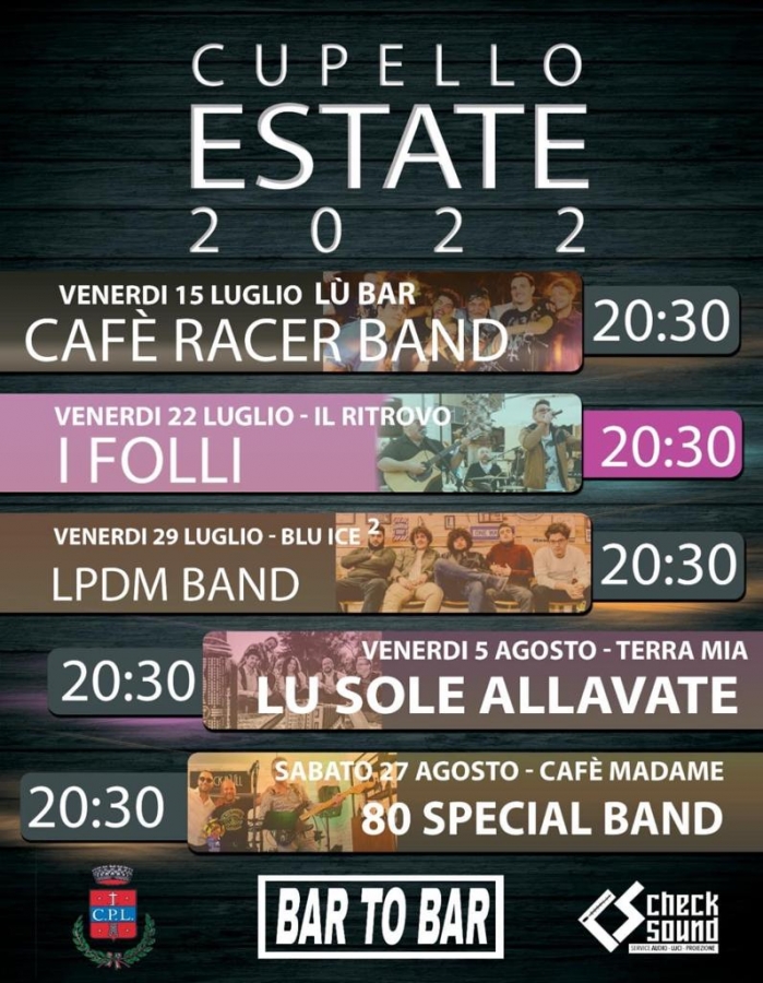 Domani, sabato 27 agosto, alle ore 20:30, a Cupello, ci sarà il quinto e ultimo appuntamento con l'evento estivo “Bar to Bar” presso Nuovo Cafè Madame.
