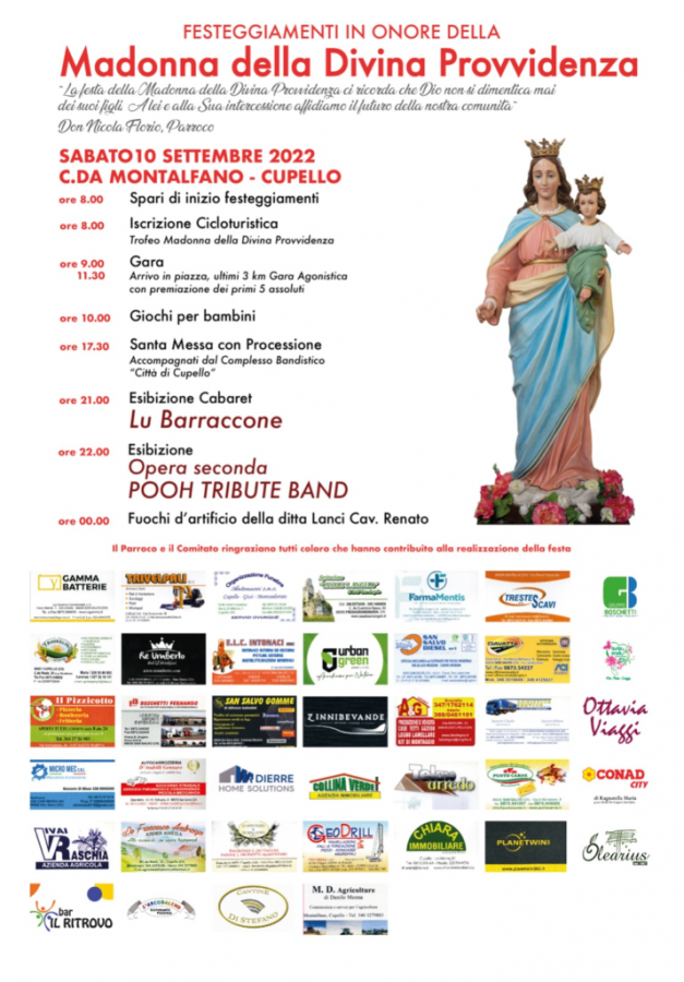 CUPELLO. Sabato 10 settembre prossimo, la comunità di Montalfano si appresta a vivere una delle feste più sentite e più partecipate: la Madonna della Divina Provvidenza.