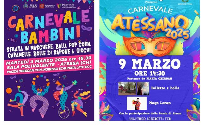 Carri, maschere, balli, animazione e artisti di strada per l’evento più colorato dell’anno. Ad Atessa ci si prepara per un doppio appuntamento: martedì 4 l’evento dedicato ai più piccoli e, domenica 9, l’esplosione della festa lungo le strade del paese.