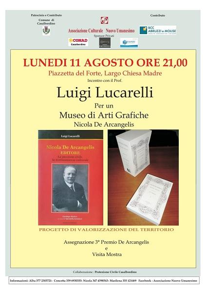 Lunedì 11 agosto alle ore 21 ci sarà un incontro, sempre in Largo del Forte, con il prof. Luigi Lucarelli. Nel corso della serata verrà assegnato il Premio De Arcangelis istituito da Nuovo Umanesimo nel 2005.