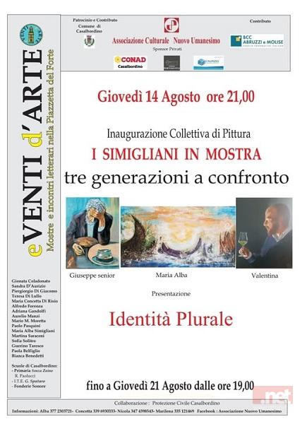 Questa sera nuovo, doppio, appuntamento, con “Eventi d’Arte” nella Saletta delle Arti in Largo del Forte. Appuntamento alle ore 21 con l’inaugurazione della Collettiva di Pittura “I Simigliani in mostra – tre generazioni a confronto” (Giuseppe senior, Maria Alba e Valentina), che rimarrà aperta fino al 21 agosto, e la presentazione del libro “Identità plurale – raccolta di versi e tele” della prof.ssa Alba Simigliani con Meta Edizioni nell’ambito del festival “Trabocchi, Libri&Rose”.