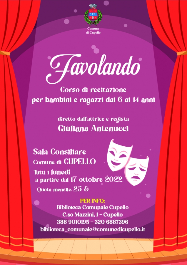 Una riflessione che – crediamo – calzi a pennello con lo spirito di Favolando, il corso di recitazione rivolto a bambini e ragazzi dai 6 ai 14 anni che si terrà tutti i lunedì a partire dal 17 ottobre a Cupello, presso la Sala Consiliare del Palazzo Comunale.