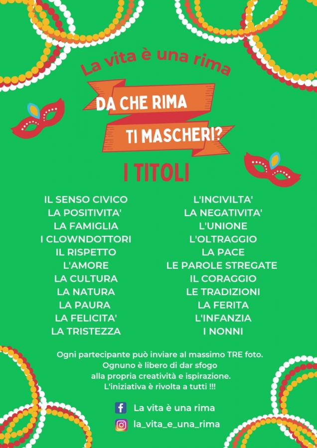 Famiglia, amore, cultura, tradizioni, ma anche paura, inciviltà e tristezza; una miriade di temi tra cui scegliere ed ispirarsi per fotoraccontare le filastrocche attraverso uno scatto. Grandi e piccini potranno cimentarsi nella realizzazione di varie pose e travestimenti carnevaleschi per meglio rappresentare i temi proposti.