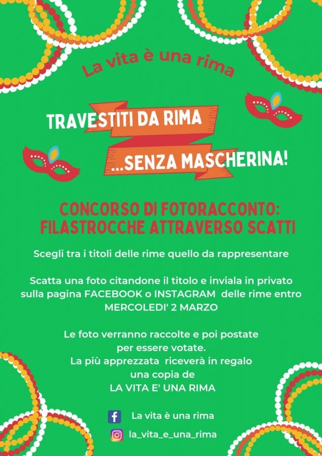 Al nastro di partenza il concorso di fotoracconto "Travestiti da rima senza mascherina" organizzato da "La vita è una rima" e dalla sua autrice Mariana Cinalli, che oltre a scrivere bellissime rime per grandi e piccini, è da sempre impegnata in attività sociali e di solidarietà nel nostro territorio.