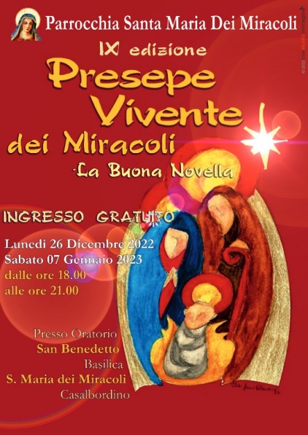 Domenica 27 novembre presso i locali dell’oratorio San Benedetto in Casalbordino è stata presentata la IX edizione del Presepe vivente dell'oratorio della Madonna dei Miracoli . Il tema 2022 sarà “la Buona Novella”: l’annuncio dell’amore di Dio verso l’uomo, messaggio antico e sempre attuale che quest’anno sembra ancora più urgente da riscoprire e vivere prima di tutto nei nostri cuori e poi nei confronti del prossimo per far risbocciare la pace.