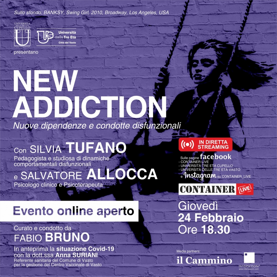 Nuovo evento curato e condotto da Fabio Bruno giovedì 24 febbraio alle ore 18:30, dal titolo “New Addiction. Nuove dipendenze e condotte disfunzionali”. Evento online aperto con la presenza di Silvia Tufano, pedagogista e studiosa di dinamiche comportamentali disfunzionali e Salvatore Allocca, psicologo e psicoterapeuta.