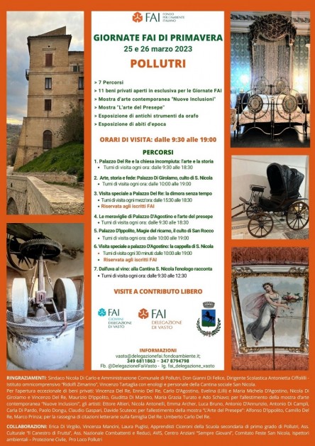 Il sindaco, Nicola Di Carlo, insieme a tutta l’Amministrazione Comunale, ha accolto con molto entusiasmo questo evento: “Siamo molto felici di ospitare le Giornate FAI di Primavera a Pollutri. È un’occasione importante per far conoscere le meraviglie del nostro borgo, ricco di tradizioni, storia, arte e cultura. Ci sarà spazio anche per le nostre eccellenze enogastronomiche con la visita alla Cantina sociale San Nicola. Siamo certi che questo evento sarà un grande successo per il nostro paese! Ringraziamo la delegazione FAI di Vasto per aver scelto Pollutri e tutti coloro che hanno dato la disponibilità a collaborare per organizzare le due Giornate: i proprietari delle dimore che saranno aperte eccezionalmente, le associazioni culturali e i gruppi di volontariato; l’Istituto Omnicomprensivo “Ridolfi-Zimarino” e tutti i volontari e delegati del FAI”.