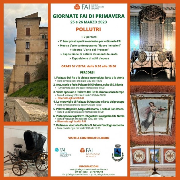 Il borgo di Pollutri è stato per noi una sorpresa inaspettata – afferma la capo delegazione Maria Rosaria Pacilli dal momento che si è rivelato uno scrigno ricolmo di preziosissimi gioielli architettonici, artistici e culturali, senza tralasciare le tradizioni religiose e popolari che rimandano ad un passato ancora oggi molto vivo nell’animo dei pollutresi. La nostra delegazione è riuscita a ottenere l’apertura, in esclusiva per il pubblico del FAI, di ben 11 beni privati che, ne siamo certi, vi lasceranno senza parole. Gli ospiti saranno accompagnati dalla narrazione dei volontari del Gruppo FAI Giovani di Vasto e degli Apprendisti Ciceroni della Scuola secondaria di I grado “Dante Alighieri” di Pollutri, che renderanno ancora più piacevole e suggestiva ogni visita. Naturalmente il nostro consiglio è di usufruire di tutti gli itinerari proposti, in quanto ognuno di essi presenta particolarità e dettagli davvero unici e irripetibili”.