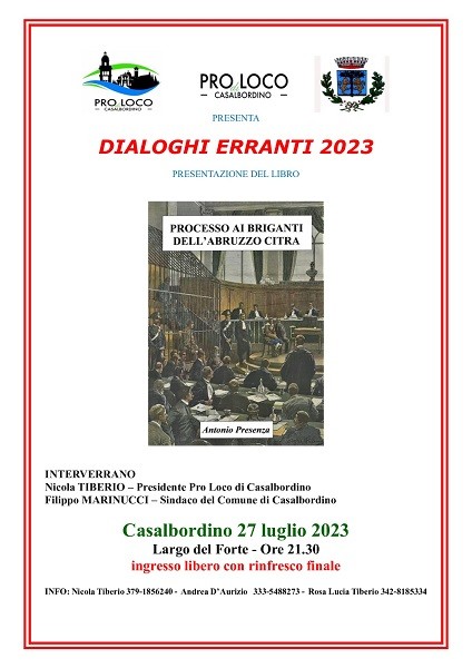 Prosegue il ciclo “Dialoghi erranti” proposto anche quest’estate dalla Pro Loco di Casalbordino, inserito nel calendario delle manifestazioni estive casalesi e patrocinato dal Comune di Casalbordino.