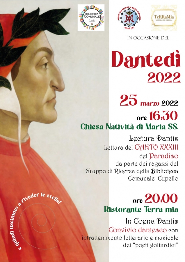In occasione del Dantedì, Giornata nazionale dedicata a Dante Alighieri - istituita dal Consiglio dei Ministri nel 2020, su proposta del Ministro della cultura Dario Franceschini – anche Cupello è pronta a omaggiare il poeta fiorentino e il suo genio.