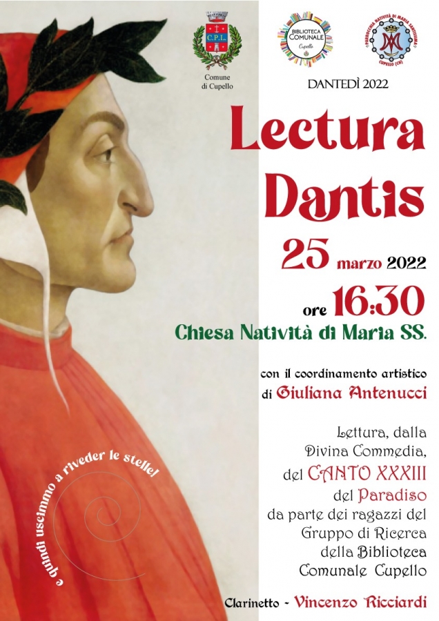 Appuntamento, quindi, oggi 25 marzo, alle ore 16:30, presso la Chiesa della Natività di Maria Santissima: i ragazzi del team di ricerca della Biblioteca comunale di Cupello, con il coordinamento artistico della regista e attrice cupellese Giuliana Antenucci, declameranno il canto XXXIII del Paradiso, invocazione alla Vergine come “umile e alta più che creatura” e insieme supplica come liberazione dal peccato.