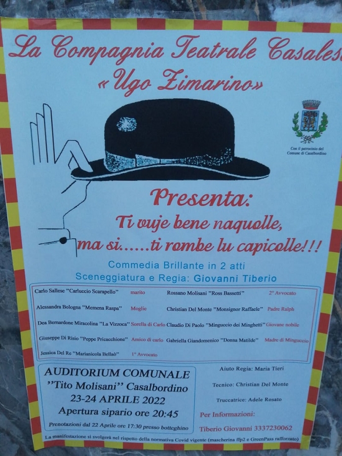 È quanto avverrà questo fine settimana con il grande e atteso ritorno della Compagnia Teatrale Casalese “Ugo Zimarino”. Appuntamento alle 20,45 di sabato 23 aprile con l’apertura del sipario dell’auditorium comunale in via Martiri dell’11 settembre, con il patrocinio del Comune di Casalbordino. Bis la sera successiva, domenica 24 aprile. In scena la commedia brillante in due atti “Ti vuje bene naquolle, ma si …. ti rombe lu capicoll”. È lo spettacolo che in questo 2022 proporrà la compagnia con la regia del professor Giovanni Tiberio.