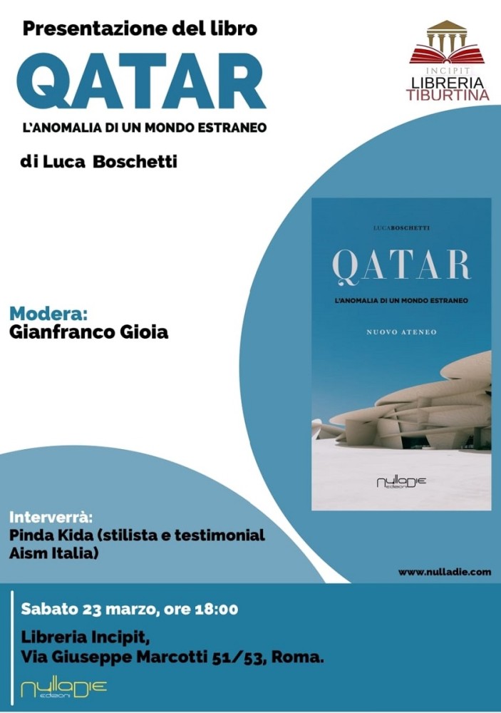Sabato 23 marzo, alle ore 18:00, presso la Libreria Incipit in via Giuseppe Marcotti a Roma sarà possibile incontrare l’autore e ascoltare dalla sua viva voce il racconto della sua passione per lo Stato del Qatar, “terra di mille contraddizioni e di estremo fascino millenario, dalla storia ricca e articolata”.