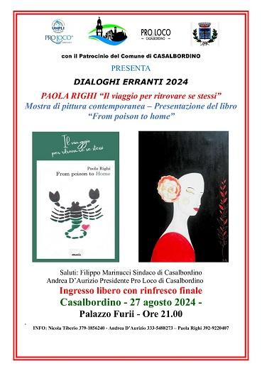 “Il viaggio per ritrovare se stessi” è il titolo dell’incontro in cui, dopo i saluti istituzionali del sindaco Filippo Marinucci e l’introduzione del presidente della Pro Loco Andrea D’Aurizio, ci sarà la presentazione del libro “From poison to home” con l’autrice Paola Righi e sarà possibile visitare la mostra di pittura contemporanea di opere della stessa Paola Righi.