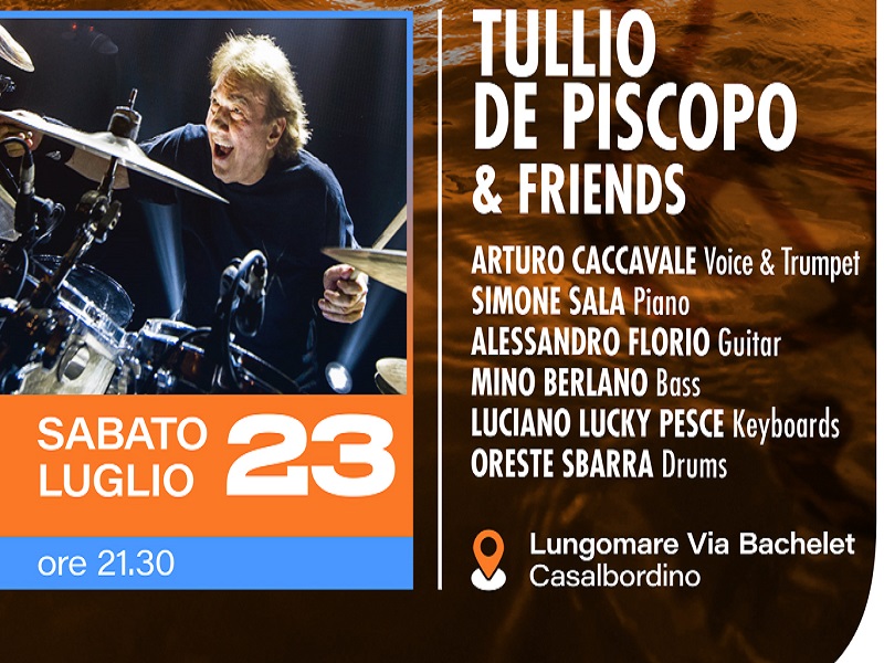 Sabato 23 luglio ore 21.30 sul lungomare di Casalbordino, via Bachelet, con “Tullio De Piscopo&friends”. Un concerto completamente gratuito con la partecipazione di Tullio De Piscopo, batterista italiano neo premiato con il Leone alla carriera di Venezia, accompagnato da Arturo Caccavalle (voce e tromba), Oreste Sbarra(batteria), Alessandro Florio (chitarra), Luciano Lucky Pesce (tastiere), Mino Berlano (basso) e Simone Sala (pianista).