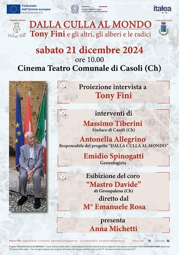 Sabato 21 dicembre, alle ore 10, al Teatro comunale di Casoli, si terrà la manifestazione "Tony Fini e gli altri, gli alberi e la radici" con ingresso libero.