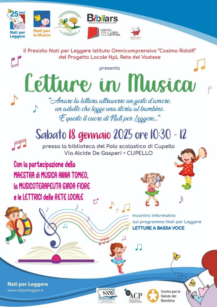 Sabato 18 gennaio, dalle ore 10:30 alle 12, la biblioteca del polo scolastico di Cupello, in via Alcide De Gasperi, ospiterà l’evento Letture in Musica, aperto ai bambini del territorio e alle loro famiglie.