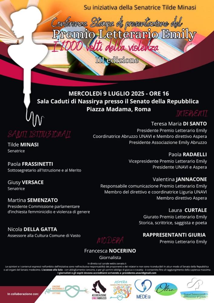 Dopo la presentazione al Parlamento Europeo di Bruxelles, il 5 dicembre scorso, e a pochi giorni di distanza dal debutto “in casa”, presso la Sala Consiliare del Comune di Vasto, il Premio Letterario Emily “I mille volti della violenza” approda – per la seconda volta – in Senato.