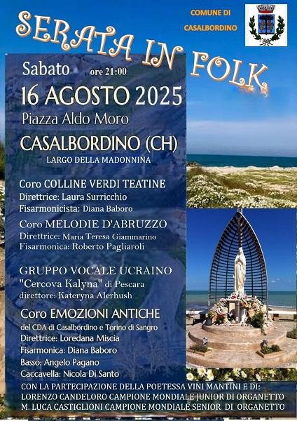 «Una serata dedicata alla musica popolare, al folklore e alla nostra identità culturale, immersi nella splendida atmosfera del Lido di Casalbordino, con il suggestivo repertorio del Coro Emozioni Antiche del Centro Ricreativo della terza età di Casalbordino e Torino di Sangro, diretto dalla Maestra Loredana Miscia, del Coro Colline Verdi Teatine, Coro Melodie d’Abruzzo e il Gruppo Vocale ucraino "Cercova Kalyna" di Pescara» riporta l'Amministrazione Comunale.