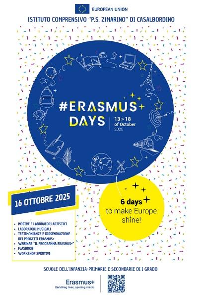 L’Istituto Comprensivo “P.S. Zimarino” di Casalbordino, Scerni, Pollutri e Villalfonsina ha celebrato con entusiasmo gli Erasmus Days, l’iniziativa europea che ogni anno promuove la disseminazione e la valorizzazione del programma Erasmus+ dal 13 al 18 ottobre.
