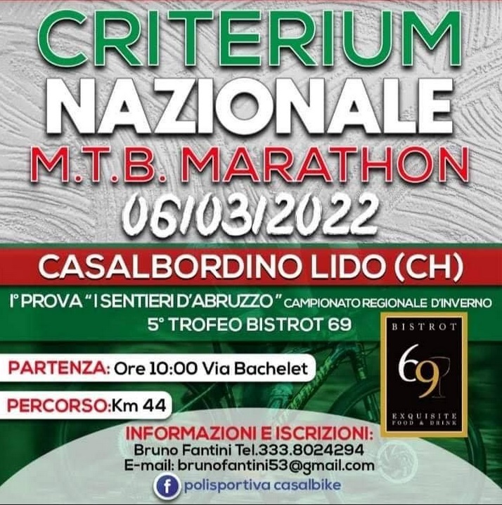 Nuovo grande appuntamento sportivo a Casalbordino domenica 6 marzo, con il Trofeo Bistrot 69 organizzato dalla Polisportiva Casalbike-Team Iachini Cycling. Una quinta edizione della competizione per la specialità mountain bike che già ha registrato un importante successo. Sarà infatti un’edizione record per partecipazione: 210 gli iscritti, “cifra mai toccata nelle precedenti annate per una manifestazione che rappresenta una delle tappe principali dell’attività fuoristrada in seno alla Uisp con l’abbinamento a prova di Criterium Mtb Marathon, circuito che richiama tanti bikers da tante zone d’Italia tesserati Uisp” sottolineano gli organizzatori.