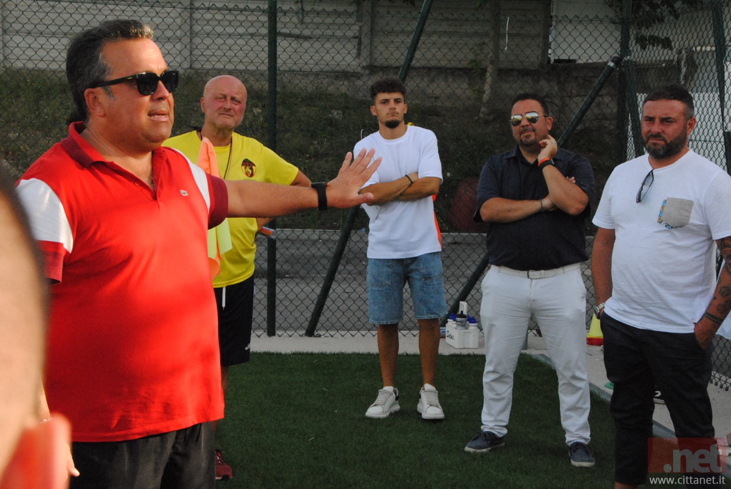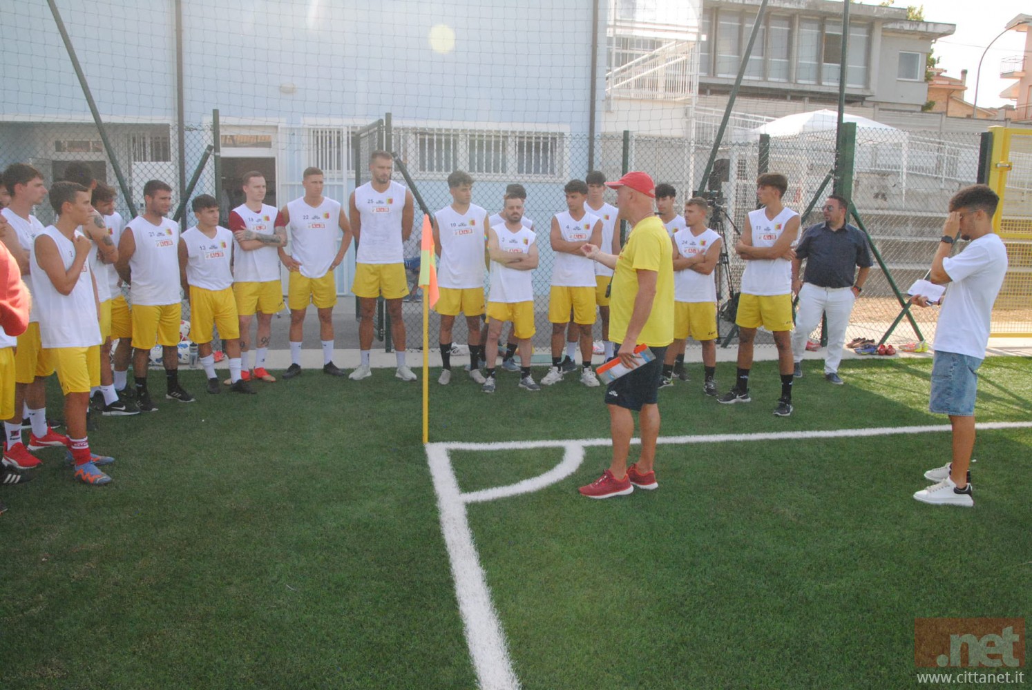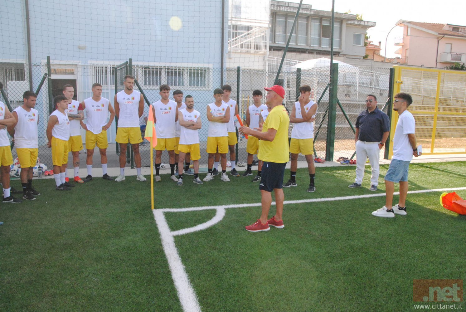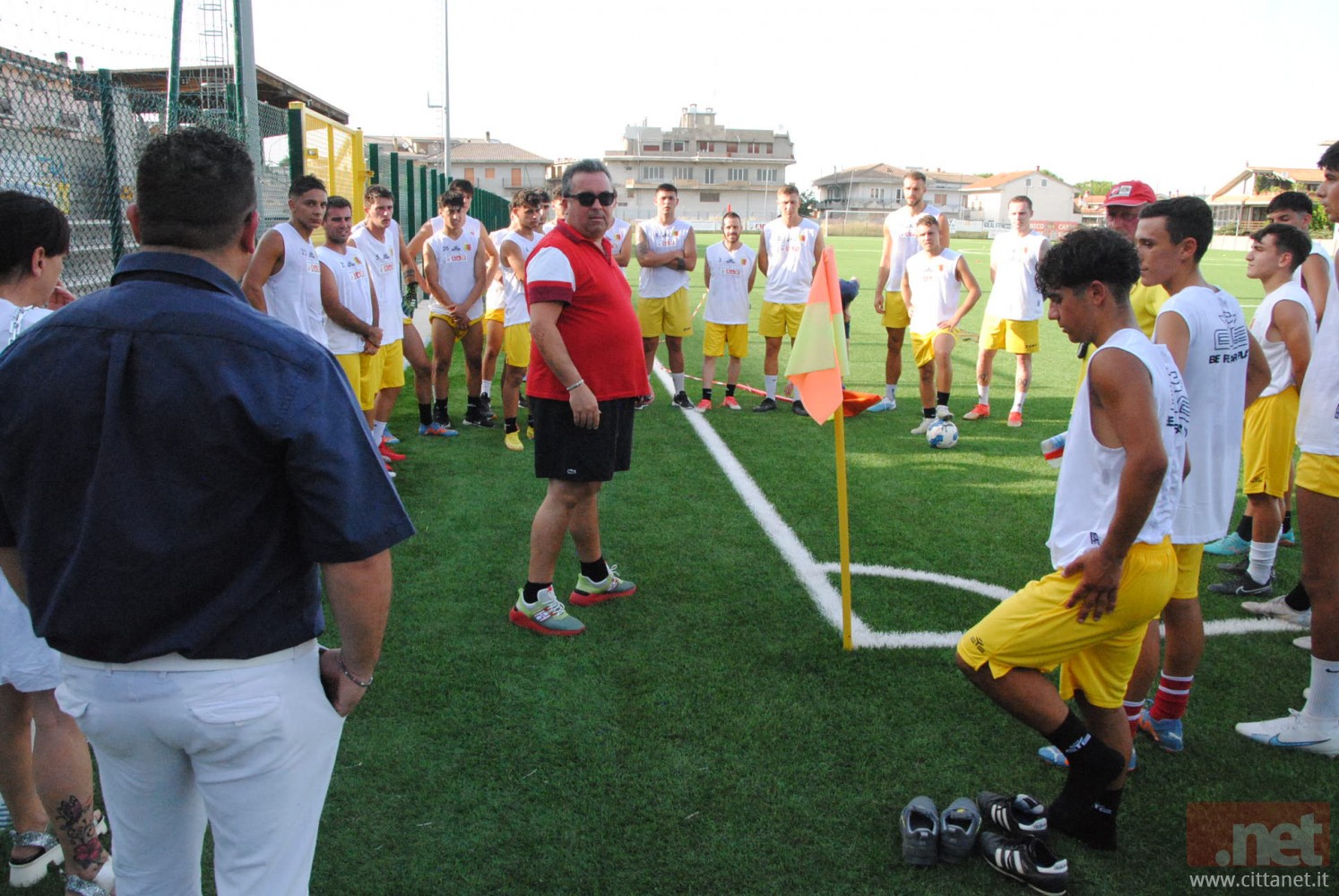 Ci sono, tra gli altri, il direttore generale Nicola Travaglini, il direttore sportivo Gianluca Senese, la presidentessa Paola De Camillis, il team manager Davide Di Santo, il segretario Nicola Cancelmo, il magazziniere Rodolfo Sisti, il dirigente Giuseppe Vaccaro, il preparatore dei portieri Giulio Vitucci ed il massaggiatore Nicola Delle Donne. Arriva a seduta già iniziata il patron Alessandro Santoro che raggruppa i ragazzi all’ingresso del rettangolo di gioco e dà la carica per l’inizio di questa nuova avventura, spronando tutti a dare il massimo ed a lottare, “col coltello tra i denti” come recita lo slogan tanto caro ormai al club, per l’obiettivo prioritario che deve essere la permanenza nella massima categoria calcistica regionale.