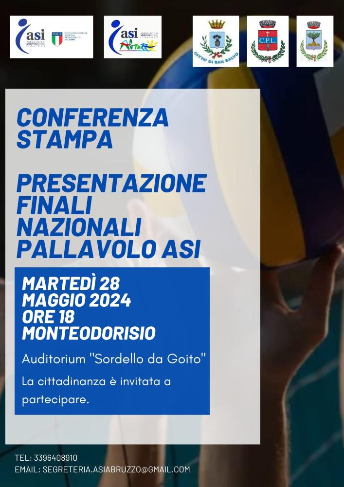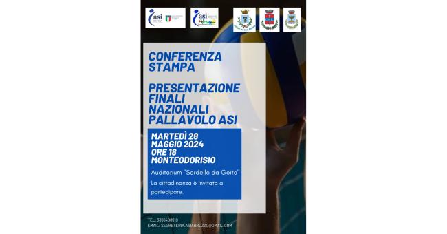 Oggi pomeriggio alle ore 18.00, presso l’Auditorium “Sordello da Goito” a Monteodorisio, si terrà la conferenza stampa di presentazione delle Finali Nazionali di Pallavolo Asi.