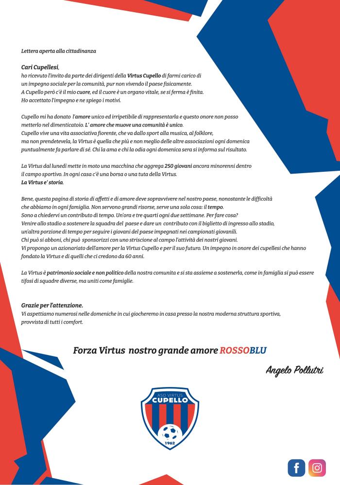 Angelo Pollutri, presidente della Virtus Cupello, lancia un appello alla comunità per dare ulteriore forza e sostegno alla realtà calcistica rossoblù, protagonista con la sua prima squadra nel Campionato abruzzese di Eccellenza e con il suo settore giovanile nei tornei regionali e provinciali.