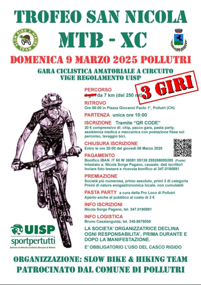 Tra le manifestazioni in rampa di lancio in questo 2025, il Trofeo San Nicola di mountain bike che si terrà domenica 9 marzo a Pollutri. L'evento nasce da un'idea del vice presidente Bruno Casalanguida che ha fortemente voluto portare una competizione ciclistica nel suo paese. Pollutri, con il suo territorio ricco di percorsi suggestivi e panorami mozzafiato, si presta perfettamente a una manifestazione del genere, regalando agli spettatori l'opportunità di seguire la gara direttamente dal terrazzo del paese.