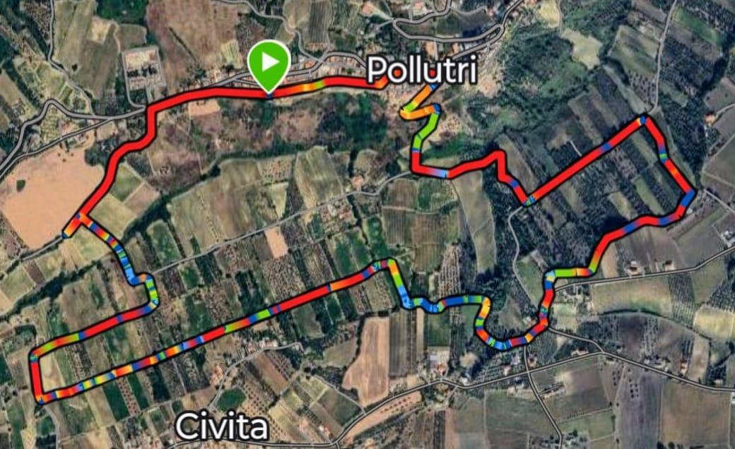 Con i due punti iconici del muraglione e del belvedere, Pollutri ha offerto agli organizzatori l'ispirazione per creare un percorso che permetta di seguire lo spettacolo dall'alto, come in un anfiteatro. Il tracciato prevede tre giri da 7 chilometri ciascuno, con 250 metri di dislivello, caratterizzati da ripidi strappi in salita e discese tecniche. Il percorso si snoda tra le campagne circostanti con passaggi nel paese, dove ritrovo (alle 8:00), partenza (alle 10:00) e arrivo sono ubicati in piazza Giovanni Paolo I.