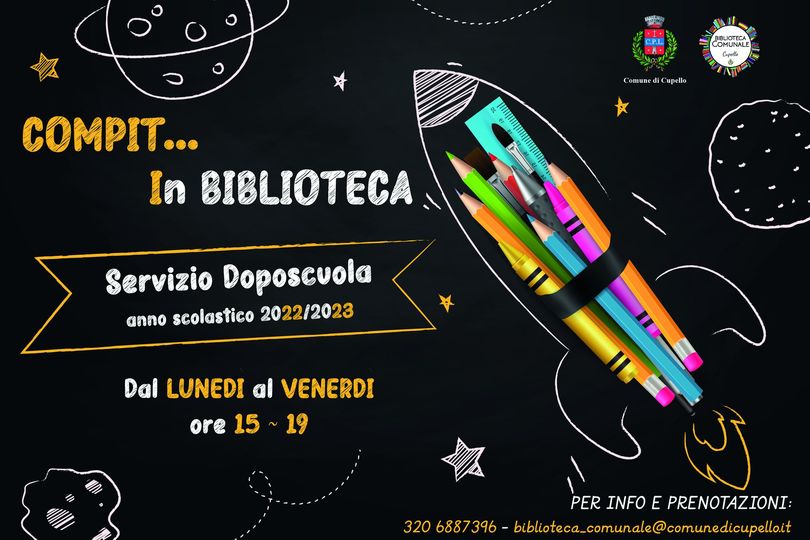 È la stessa Biblioteca a darne notizia con un post pubblicato sulla propria pagina Facebook qualche giorno fa (e ribadito ieri con l’augurio per la ripresa delle lezioni) in previsione di “un anno scolastico spaziale…”: "Siamo lieti di comunicare che da lunedì 3 ottobre sarà nuovamente attivo presso la nostra biblioteca il servizio doposcuola per gli alunni di scuola primaria e scuola secondaria di I grado.”.