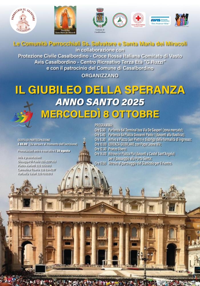 Tra poco più di un mese per le comunità parrocchiali casalesi ci sarà un nuovo appuntamento per l’Anno Santo. Mercoledì 8 ottobre le due Parrocchie di Casalbordino, SS.Salvatore e Santa Maria dei Miracoli, in collaborazione con la Protezione Civile “Madonna dell’Assunta”, la Croce Rossa Italiana, l’Avis Casalbordino "Don Antonio Tobia", il Centro Ricreativo della Terza Età "G.Ruzzi", e con il patrocinio del Comune Di Casalbordino, si recheranno a Roma per vivere il “Giubileo della Speranza” e per assistere per la prima volta all’udienza di Papa Leone VIV.