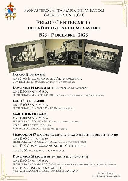 Mercoledì 17 dicembre, commemorazione solenne del centenario, ore 18 Santa Messa presieduta da P.D. Ignasi M. Fossasi Colet, Abate Presidente, ore 19.15, commemorazione del centenario, e ore 20 momento conviviale