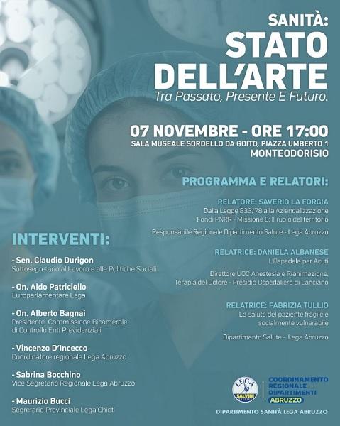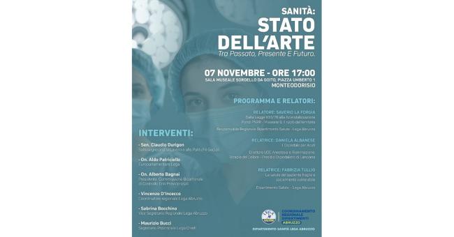 "Sanità : Stato dell'Arte tra passato, presente e futuro" è il titolo del convegno, organizzato dal Dipartimento Sanità della Lega Abruzzo, coordinato da Saverio La Forgia, in programma venerdì 7 novembre, alle ore 17, presso la Sala Museale Sordello da Goito in piazza Umberto I a Monteodorisio.