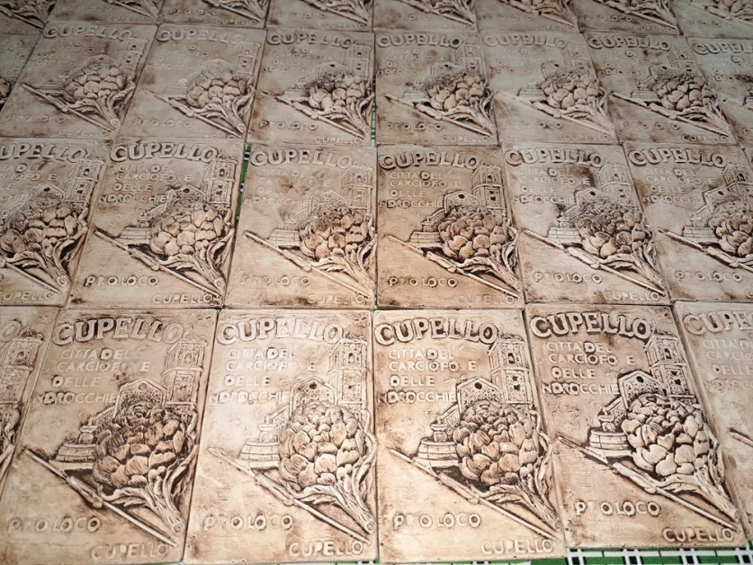 Realizzata in cemento dall’artigiano cupellese Alessandro Marisi, della locale azienda “L’arte del Manufatto” di Marilena Fagnani, la mattonella raffigura i simboli identitari del Paese abruzzese: “Sua Maestà il Carciofo, la “storica fontana” sita nel Giardinetto Comunale, “il meraviglioso Campanile” e, immancabile, il ferretto con una ‘ndrocchia, la tipica pasta cupellese.