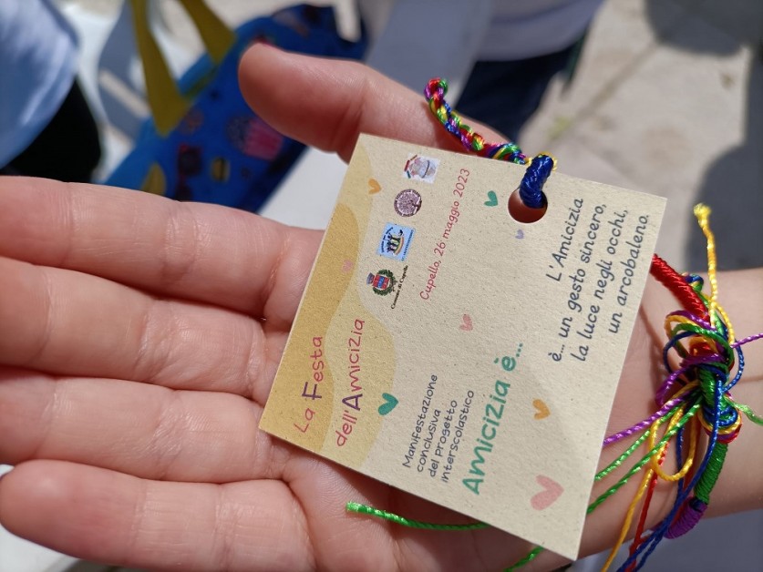 Per ognuno di essi un dono speciale realizzato e confezionato grazie alla collaborazione delle famiglie: un braccialetto simbolo di amicizia, annodato a un cartoncino su cui è stata trascritta una delle frasi dell’inno della festa “L’Amicizia è… un gesto sincero, la luce negli occhi, un arcobaleno.”. Ad ogni scuola, invece, è stato consegnato un attestato di partecipazione al progetto.