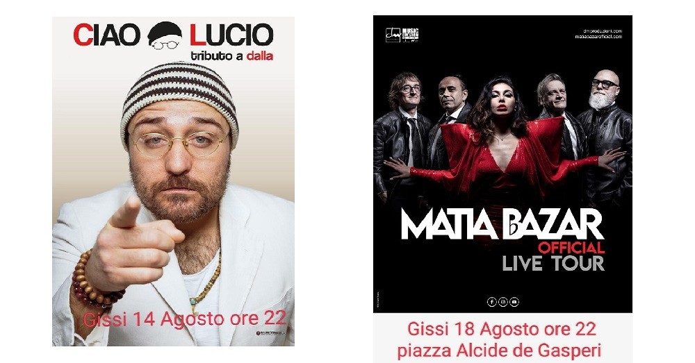 Settimana di ferragosto all’insegna della grande musica a Gissi. Due concerti all’insegna della musica d’autore italiana animeranno piazza Alcide De Gasperi nel centro del paese. Entrambi gli eventi rientrano nel calendario degli eventi estivi allestito dall’Amministrazione Comunale.