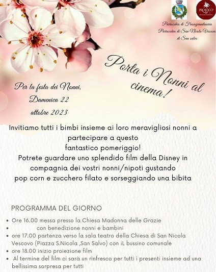 “Porta i nonni al cinema”, aprirà le porte a nonni e nipoti alle ore 17:00 con pop corn, zucchero filato e bibite per la visione congiunta, presso la sala teatro della Parrocchia di San Nicola Vescovo di San Salvo, di uno dei film di animazione più belli della produzione Disney che parla proprio dell'importante legame tra nonni e nipoti.
