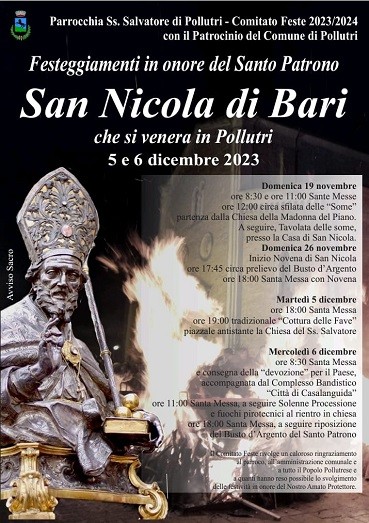 La Parrocchia S.S. Salvatore di Pollutri e il Comitato Feste 2023/2024 con il patrocinio del Comune di Pollutri hanno ufficializzato il programma per i solenni festeggiamenti in onore di San Nicola, santo la cui devozione è molto sentita dalla comunità pollutrese ed è parte fondamentale della sua stessa identità .