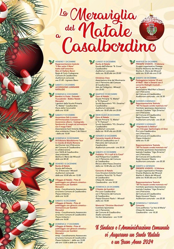 Fino al 7 Gennaio, quando ci sarà il Concerto del Coro Polifonico “Le Voci di Maria”, le prossime settimane saranno animate da eventi per grandi e piccini. Come già accaduto per gli eventi estivi, anche in occasione del calendario natalizio le Associazioni, le Scuole e i Comitati Spontanei hanno risposto in modo entusiastico, proponendo iniziative destinate a tutte le età, a cui va il mio ringraziamento, sottolinea l’assessore al Turismo Paola Basile.