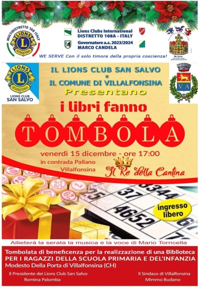 Venerdì 15 dicembre ci sarà una tombolata per raccolta fondi organizzata dai Lions con il patrocinio del Comune di Villalfonsina e che vedrà la partecipazione di tutto il paese e di chiunque voglia collaborare alla riuscita della manifestazione.