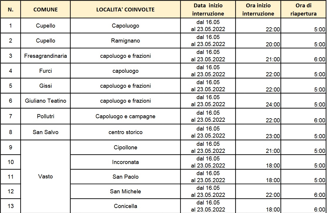 In queste ore la Sasi ha pubblicato anche l’elenco delle interruzioni programmate a partire da questa sera sino a lunedì prossimo, 23 maggio. Interruzioni che coinvolgeranno nel nostro territorio i comuni di Cupello, Fresagrandinaria, Furci, Gissi e Pollutri.