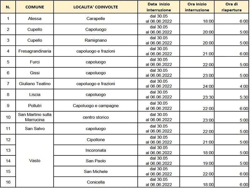 Questi i comuni coinvolti: ALTINO; ARCHI per gli utenti di Piane d’Archi; ATESSA per gli utenti di Montemarcone, San Luca, Piazzano, Via Degli Orti, Saletti, Colle Comune, Piana Vacante, Piana Matteo, Collepietre, Zona Industriale, Acquaviva, Piana La Fara; CASALBORDINO; CASOLI per gli utenti di Colle Marco; CUPELLO; FURCI; GISSI; MONTEODORISIO; PAGLIETA per gli utenti Sinaglia, Marraone, Saletti; PERANO; POLLUTRI; SAN BUONO; SAN SALVO; SCERNI; TORINO DI SANGRO per gli utenti del Capoluogo, Campo Grande, Collelongo, Quaglialatte e Cavone; VASTO; VILLALFONSINA.