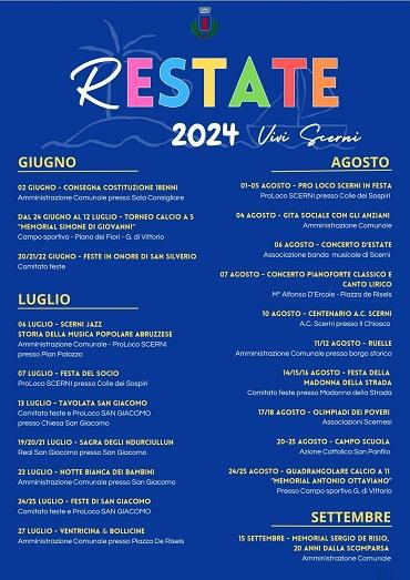 "Sarà un'estate da scoprire, da vivere tutta a Scerni che, anche quest'anno, si appresta a regalare ai residenti, ai visitatori ed ai turisti del territorio una programmazione estiva di qualità". A dichiararlo sono Daniele Carlucci, sindaco di Scerni, unitamente alla squadra di Giunta e Consiglio che sottolineano che "attraverso la collaborazione di varie realtà associative abbiamo messo in campo un tabellone Restate e Vivi Scerni con appuntamenti che spaziano dal divertimento alla cultura, dal sociale alle feste religiose, dalla musica allo sport e all'enogastronomia alla promozione delle nostre eccellenze. Un calendario frutto di una proficua collaborazione tra l'amministrazione comunale e le diverse associazioni locali e la Parrocchia, creando una bella sinergia che cresce di anno in anno, con entusiasmo e voglia di fare per il bene della comunità. Il divertimento e l'intrattenimento saranno assicurati agli adulti, ai giovani ed ai bambini ed ai turisti. Abbiamo pensato di soddisfare tutti perché vogliamo che la nostra cittadina sia sempre più a vocazione turistica, meta da scoprire con le sue bellezze, la sua storia ed eccellenze enogastronomiche. Infatti come Amministrazione punteremo e lavoriamo a quelli che sono ormai gli appuntamenti di richiamo come Ventricina&Bollicine e Lì Ruell dè lù paes che ogni anno richiamano migliaia di turisti. Ma l'intera estate è caratterizzata da diversi appuntamenti di qualità dove sarà possibile passare delle belle giornate e serate con ottimi piatti della tradizione culinaria locale. Anche sul sociale abbiamo pensato sia ai bambini sia agli anziani attraverso le varie colonie, la terza edizione della Notte Bianca dei Bambini e le gite in programma. infine sottolineiamo come l'intero programma non peserà di un solo euro sul bilancio comunale e pertanto ringraziamo gli sponsor e le varie associazioni”.